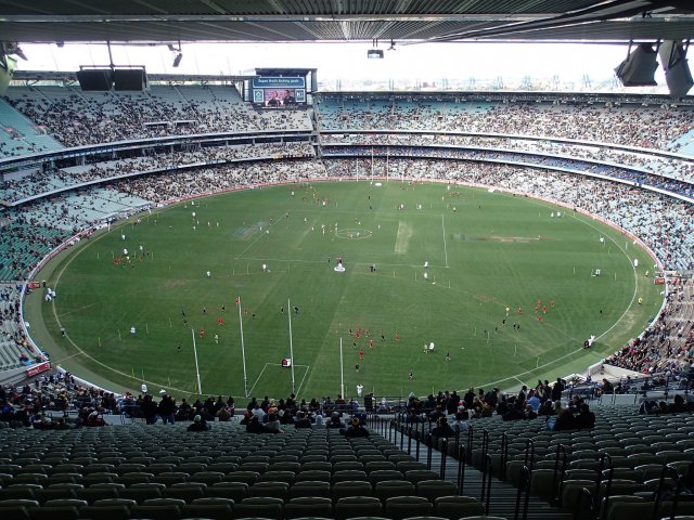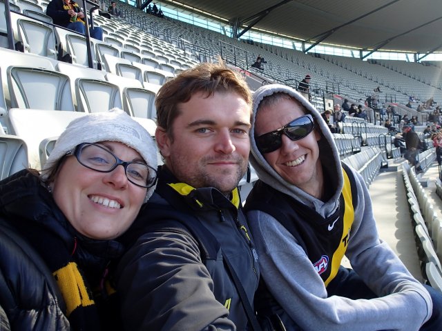 Il se joue sur un terrain rond avec une balle ovale mais plus grosse qu'au rugby. On supporte les tigres de Richemond qui ont facilement gagnés 84-57. On s'est bien amusé malgré le vent froid. On s'est heureusement réchauffé avec un café et une mini-tourte à la viande et au ketchup, comme le veut la tradition.