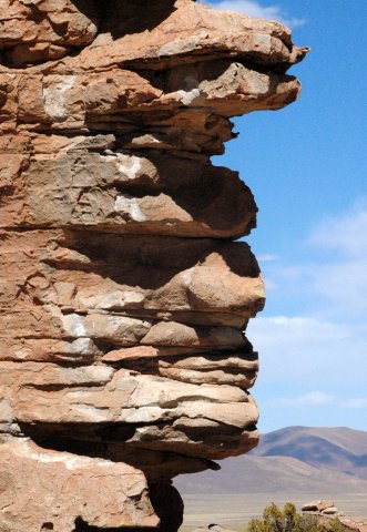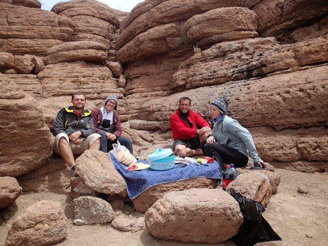 Nous arrivons à l'Arbre de Pierre, site avec de gros rochers dont un en forme d'arbre isolé des autres a de superbes couleurs. Nous nous arrêtons manger prêt de gros rochers dans lesquels vivent des Viscachas, gros lapin à longue queue, qui viennent même manger ce qu'on leur donne du bout des doigts (tomates, concombres...). Ce midi, Lino nous a apporté une bonne salade de thon et de riz bien rafraîchissante, il commence à faire chaud sous le soleil!
