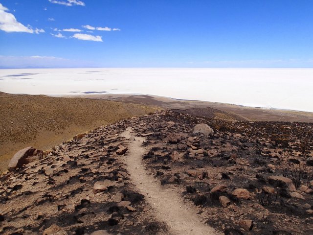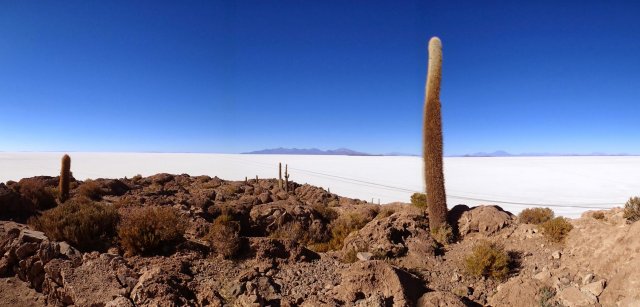 Nous remontons dans le 4x4 et roulons jusqu'à une surprenante île de corail pétrifié et de cactus, certaines on plus de 100 ans. Le paysage est incroyable et surréaliste. On est ébloui par ce blanc qui nous entoure et fascinés par cette île que nous parcourons dans ces moindres recoins. On croise 2 lamas et pleins de petits oiseaux plus un viscacha, lapin à longue queue.