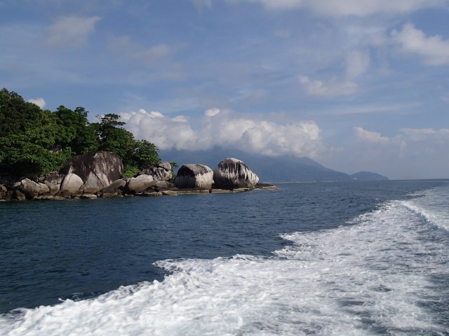 Le 30, départ 10h pour notre tour de snorkeling qui va nous emmener sur 3 sites sur Coral Island et Monkey Bay. On se retrouve avec 2 gentilles familles Malaisiennes, ils portent tous leur gilets de sauvetage, la nage n'est pas leur fort. Ils sont comme beaucoup de locaux assez curieux et veulent savoir d'où on vient, où on va, le budget d'un tel voyage... Au deuxième arrêt un des enfants a malheureusement voulu aller dans l'eau sans gilet... très mauvaise idée, il est conduit à l'hôpital (heureusement il a été 'repêché' à tant et s'en sortira), nous, nous attendons sur la plage 2 heures en compagnie des puces des sables (qui ont tendance à bien aimé le sang d'Audrey) et des varans qui aimeraient goûter les restes de notre repas ! Au retour du bateau on continue notre ballade au-dessus des coraux (pas tous en très bon état on doit le dire) et parmi les tortues, les requins, un poisson ballon qui s'est bien laissé photographier et tous les autres habitants de cette belle et limpide mer de Chine. Ce soir, on prépare nos sacs ; demain destination Singapour...