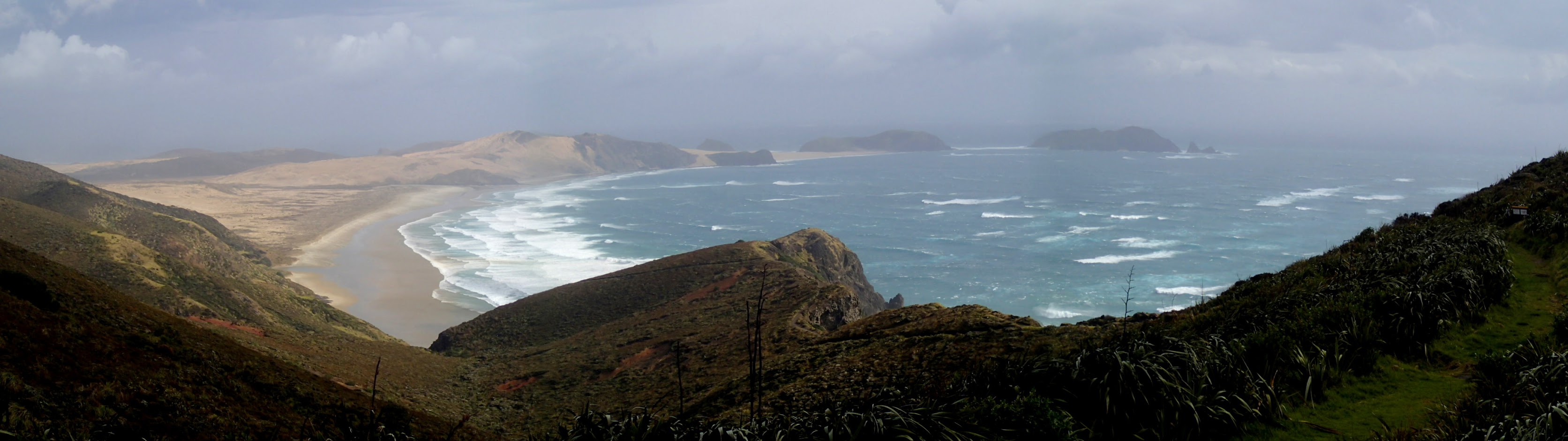 Le 5 septembre le soleil n'est pas de la partie mais ça ne nous empêche pas d'aller explorer le bout de l'île du nord. On se ballade le long de plages et faisons plusieurs stop sur des points de vues qui donnent sur différentes baies et presqu'île. On arrive enfin au bout, au Cape Reinga qui marque le partage des eaux entre la mer de Tasmanie à l'ouest et l'océan Pacifique. Malheureusement il pleut, mais ça à son charme aussi! On marche jusqu'au phare et sur le retour on a droit à une petite éclaircie. Le coin est superbe, la nature est luxuriante et commence même à donner quelques fleurs, nous sommes en fait au début du printemps... Nous repartons maintenant pour Paihia, nous avons gardés quelques points de vu pour la route du retour, ils se trouvent tous côté ouest, où se trouve notamment la '90 miles Beach' : plage rectiligne de 140 km de long sur laquelle des bus et autres 4X4 peuvent circuler.Nous découvrons également de belles dunes de sable. On reste pour observer le coucher de soleil, mais les derniers nuages qui restent gâchent un peu le final! Le ciel est somme toute magnifique et la mer est bien déchaînée, c'est superbe!