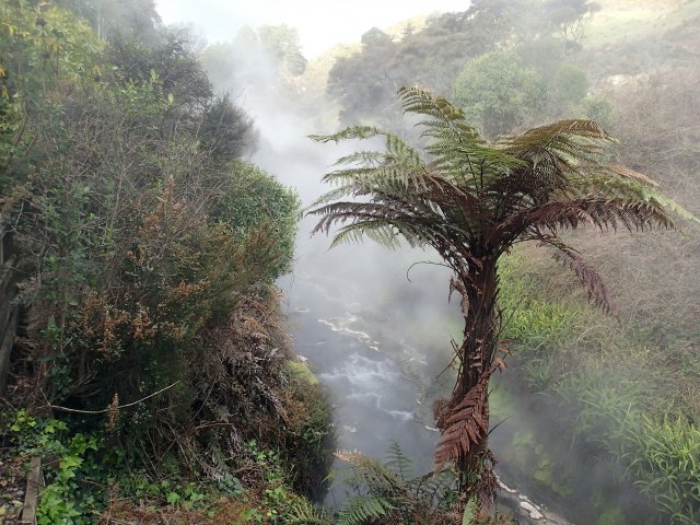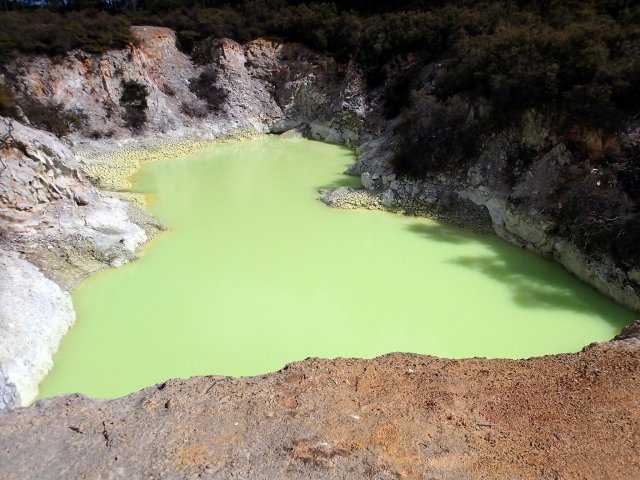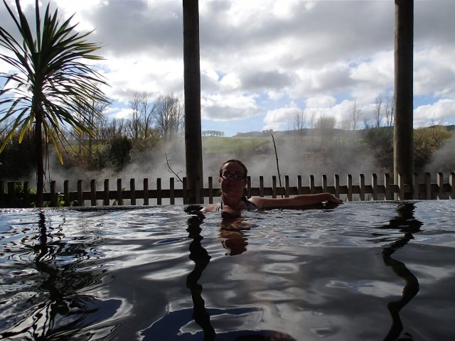 Nous nous baladons ensuite pendant 3h à l'intérieur du parc entre cratères, lacs de couleur jaune, blanc, rouge, des terrasses minérales, des mares de boue et des flaques bouillonnantes. On ressent ici la terre s'exprimer à travers le bruit des bulles qui éclatent et le mouvement des volutes de vapeur. On se rend en seconde partie de journée à Waikite thermal pool, un petit spa dans la nature avec des piscines entre 38-41°C d'eau thermale. On peut même aller voir la source qui est à quelques mètres et qui bouillonne.