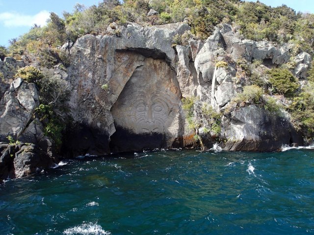 Le 10 septembre, nous partons explorer le lac de Taupo à bord d'un bateau qui nous amènent à des fameuses sculpture maoris, sur une falaise, à moitié immergés. L’œuvre est récente (30 ans) mais le travail est très beau et l'effet avec l'eau vaut le détour. Une fois au port, on part manger sur le point de vue qui domine la ville et le lac.
