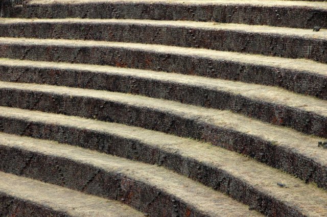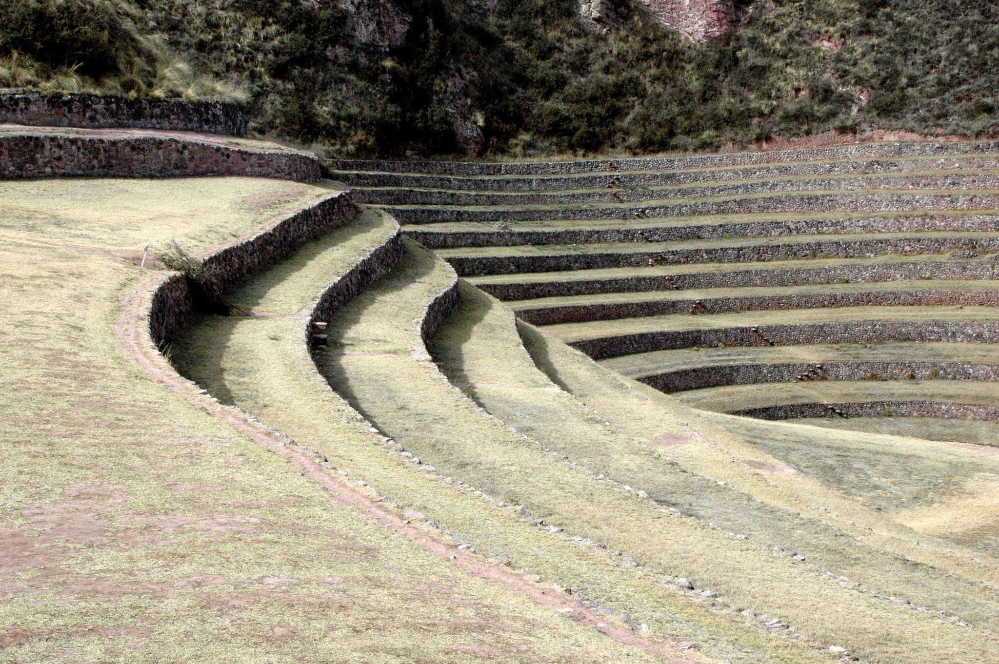 On arrive au premier site, nommé Moray. C'est un amphithéâtre en terrasse, creusé dans la montagne, qui était un centre de recherche agricole Inca. La position des terrasses créée toute une série de microclimats. La température est plus élevée au centre mais diminue ensuite en fonction de la distance de chaque terrasse. Cela permet de simuler une vingtaine de microclimats différents.