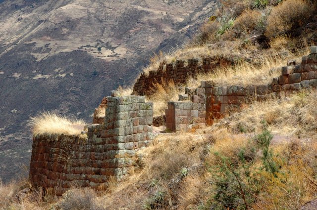 Le 19 septembre, après une nuit mouvementée par des centaines de virages et une prise d'altitude conséquente (4070m) nous découvrons au matin, dans la région de Cusco, un paysage bien plus vert avec de petits villages le long de la route. On observe avec joie des locaux en tenues traditionnelles, des ânes, des lamas, nous sommes bien au Pérou, pas de doute! Il est 7h, nous arrivons à Cusco, à 3000m d'altitude. Nous n'allons pas visiter la ville tout de suite, nous le ferons après le Machu Picchu. Nous partons pour Pisac, première ville de la Vallée Sacrée que nous voulons découvrir. Nous y arrivons tôt, après 1h de bus local, trouvons notre hôtel pour y déposer les sacs et partons explorer le village et les fameuses ruines Incas. Nous sommes à 2600 m d'altitude et une première petite randonnée nous attend. Après notre long voyage et le décalage horaire encore présent nous décidons d'y aller tranquillement. Nous gravissons la montagne à travers les anciennes terrasses construites par les Incas et arrivons aux ruines de Pisac puis au temple du soleil de Intihuatana, avant d'atteindre la citadelle Q'Allaqasa et finalement Kinchiracay. Ce fût 3h30 de ballade magnifique à la découverte de ces sites Incas dominants de somptueux paysages de montagne.