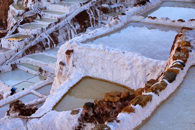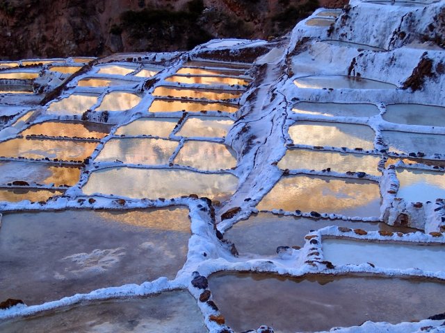 On part ensuite pour le second site, non moins intéressant car il s'agit des Salines de Maras. A cet endroit coule une source d'eau chaude chargée en sel que les Incas ont détournés vers des terrasses pour y récolter le sel. C'est un spectacle grandiose de 5740 petits bassins blancs accrochés à la montagne où y travaillent les habitants du village de Maras. La palette de couleur est aussi ici impressionnante et ravie nos yeux. Nous finissons la journée par un arrêt au point de vue dominant la ville.