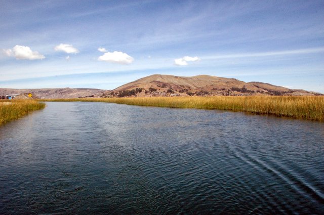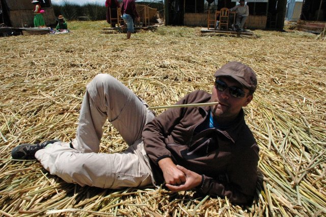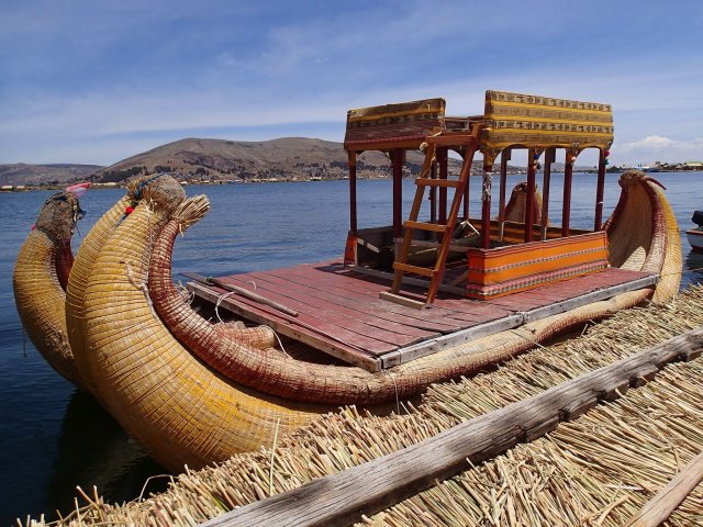 La découverte des îles fut très intéressante mais bien trop touristique. Ces îlots fabriqués en terre et en roseaux ont permis à l'époque au peuple d'Uros d'échapper à l'invasion des Incas et de se réfugier sur le lac Titicaca. Ce peuple s'est éteint dans les années 1950 et les indiens de Puno s'y sont installés perpétuant les traditions pour le plaisir des touristes! Après un essayage d'une tenue traditionnelle et un passage vers le stand souvenir, on emprunte, un peu contraint, un bateau local, en roseaux, pour se rendre sur une 2ème île.
