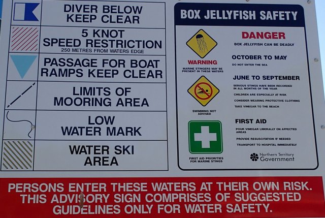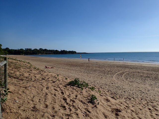 Les navettes pour le centre ville sont très chères, mais nous arrivons après un peu de difficulté et de marche à prendre un bus local pour 8 fois moins cher ! Darwin nous semble une petite ville paisible avec quelques rues animées du coté du port. On flâne dans les rues et visitons un parc bordant la mer. L'après midi, on se dirige vers une plage un peu excentrée, mais pas question de se baigner, il y a des méduses mortelles qui rodent...