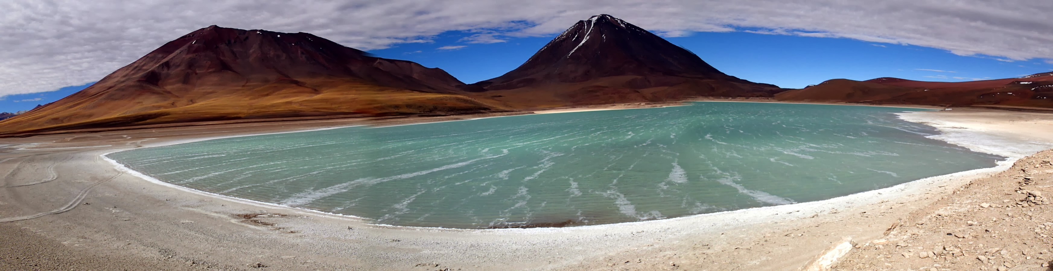 On observe maintenant le volcan Licancabur haut de 5920m et le laguna verde, un lac vert émeraude au pied du volcan. Nous sommes à 5100 m d'altitude, il fait un peu plus frais que dans le reste du désert mais le soleil nous réchauffe toujours un peu.