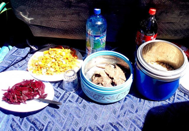On s'arrête pic-niquer au bord de la route un repas bien complet (salade, quinoa, steak de lama).