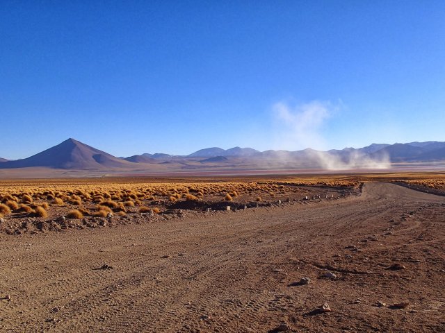 On admire sur la "route" ses immenses étendues désertiques, plates, sans végétation, sans vie mais vraiment magnifiques puis là, le lac Hediando, et ses vagues blanches (borax) et le lac Cañapa où des centaines de flamants roses se restaurent. Nous marchons le long du lac pour les observer de plus prêts.