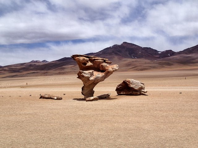 Nous arrivons à l'Arbre de Pierre, site avec de gros rochers dont un en forme d'arbre isolé des autres a de superbes couleurs. Nous nous arrêtons manger prêt de gros rochers dans lesquels vivent des Viscachas, gros lapin à longue queue, qui viennent même manger ce qu'on leur donne du bout des doigts (tomates, concombres...). Ce midi, Lino nous a apporté une bonne salade de thon et de riz bien rafraîchissante, il commence à faire chaud sous le soleil!