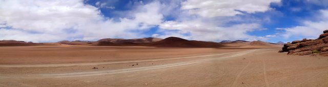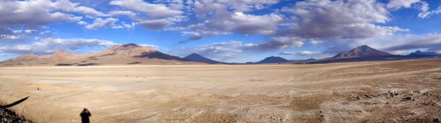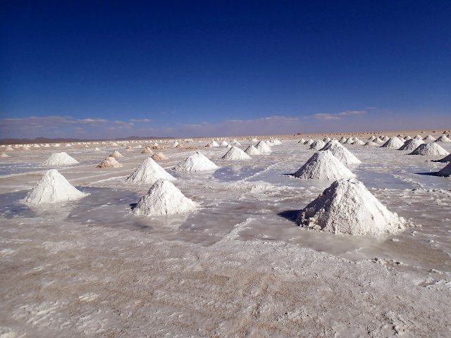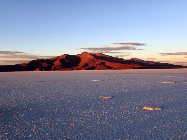 De retour au 4x4 on mange avec Lino un bon poulet, des pâtes, de la salade et des bananes frites, ça nous requinque! On emprunte ensuite un petit chemin pour aller voir des momies vieilles de 1300 ans. Elles ont été conservées grâce à une pommade faite avec des coques de quinoa. Il y a dans cette grotte-cimetière 2 femmes, 2 bébés et 3 hommes. Ils tiennent tous une position fœtal pour pouvoir se réincarner (croyance des incas). Nous quittons le volcan et nous arrêtons en plein milieu du désert pour voir un hôtel de sel construit ici, seul au milieu de nul part. Un peu plus loin nous observons les “yeux” de sel, des trous dans la couche de sel, fine à cet endroit, dans lesquels on voit l'eau buller. Elle arrive directement de la montagne au bord du salar et est chargée en minéraux dont du lithium. On apprend que le salar représente plus de la moitié des réserves en lithium de la planète. Une richesse, donc, très importante pour le Bolivie. Bien sur le sel du salar est aussi exploité pour de la production de sel alimentaire. On découvre ensuite des centaines de petites pyramides de sels, résultat du travail des habitants du salar venu récupérer du sel.