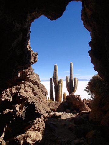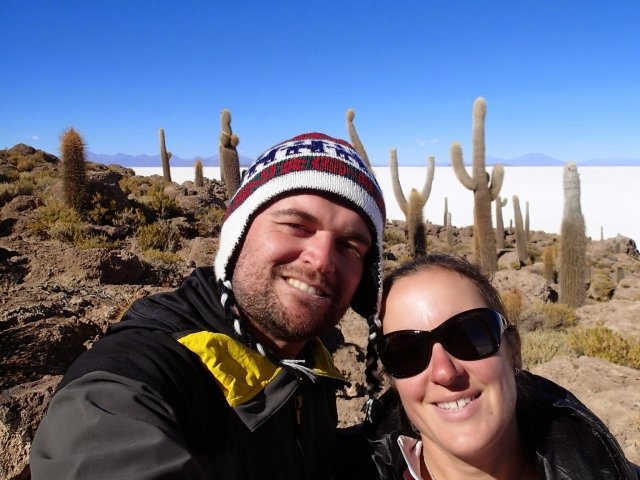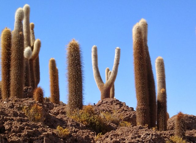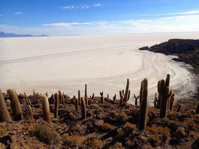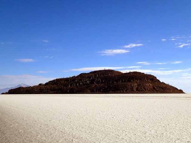 Nous remontons dans le 4x4 et roulons jusqu'à une surprenante île de corail pétrifié et de cactus, certaines on plus de 100 ans. Le paysage est incroyable et surréaliste. On est ébloui par ce blanc qui nous entoure et fascinés par cette île que nous parcourons dans ces moindres recoins. On croise 2 lamas et pleins de petits oiseaux plus un viscacha, lapin à longue queue.