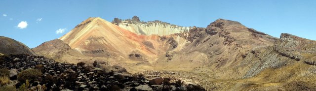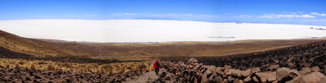 Nous roulons maintenant à travers cette immensité blanche vers le volcan Tunupa. On grimpe jusqu'au premier point de vu à pied, une belle heure de marche entre les terrasses de culture (dont certaine de quinoa) toute en montée à 4000m....dure dure la respiration! Très fières d'être en haut on se pose pour admirer le paysage. Le cratère du volcan nous offre une multitude de couleurs magnifiques, jaune, vert, rouge, marron, bleu, ocre... C'est trop chouette, surtout devant ce salar!