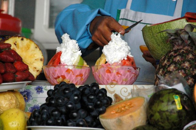 On arrive a prouver notre bonne fois et on quitte la ville en bus. 3h de route plus tard nous voilà dans la "ville blanche", deuxième capitale du pays (capitale historique). Il est déjà 13h on décide de manger à la gare routière, puis on prend un taxi pour la rue des hôtel. Ici comme beaucoup de pays visités, chaque rue a sa spécialité. Les sacs sont posés à l'hôtel, nous allons découvrir cette belle ville. On ne résiste pas à traverser le marché, acheter de bon fruits, mangues et Chirimoya, et Patrick nous propose une pause salade de fruits. Il nous offre une délicieuse composition de fruit, yaourt et chantilly préparée dans un des nombreux stand coloré par des tonnes de fruits. Merci encore!