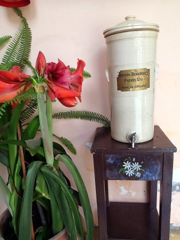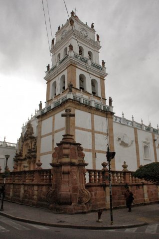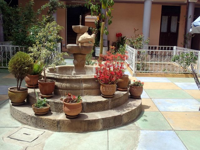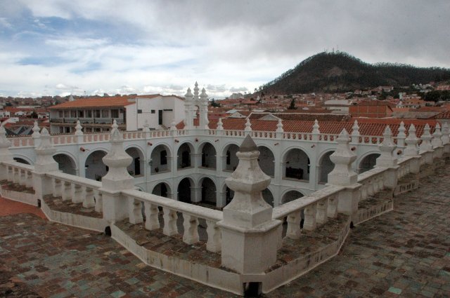 Le 11 octobre on termine les affaires commencées la veille et on prépare nos sacs, on quitte Sucre ce soir pour aller à Cochabamba. On se promène dans la ville qui soit dit en passant est charmante avec toutes ces façades blanches. On visite une église dont l'ancien couvent sert aujourd'hui d'école. On monte sur les terrasses et les toits, la vue est belle et le toit carrelé avec différents carrelage est charmant. L'intérieur de l'église est sobre et pas très grande. La cours centrale du couvent est très lumineuse et encore une fois bien fleurie.