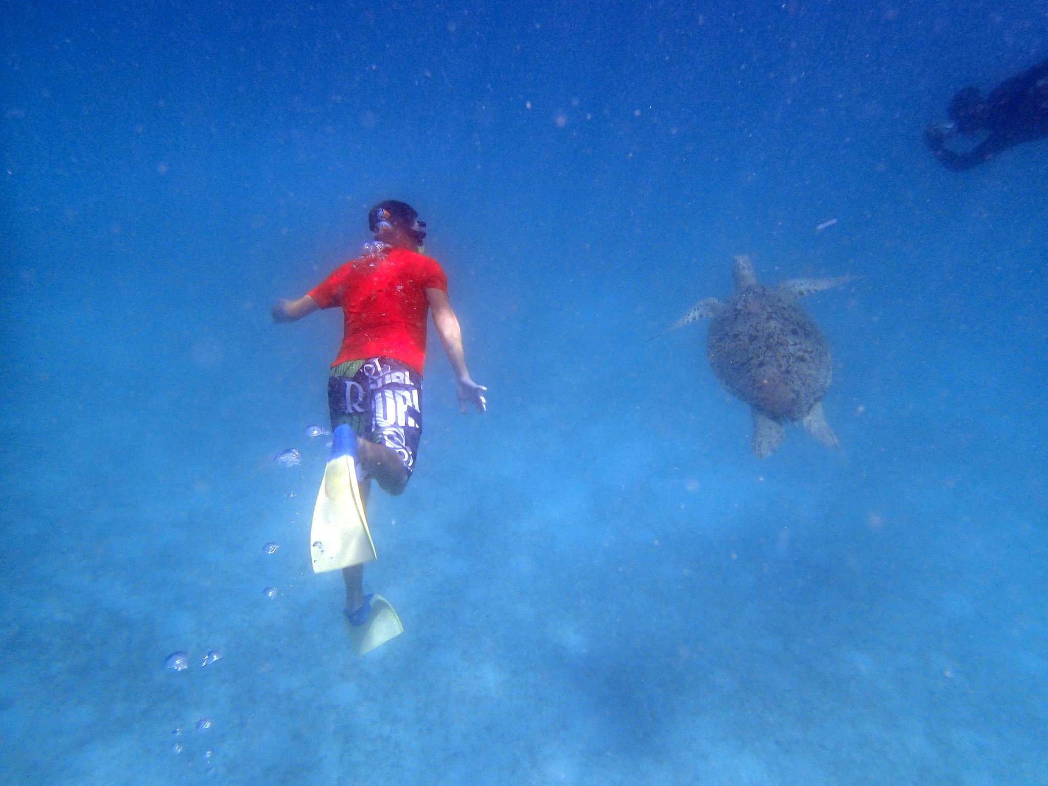 Nous sommes le dimanche 19 mai, Jérôme part ce matin faire une plongée sur le site de sugar wreck, il découvre une épave de 90m de long et de monbreuses cachettes pour les poissons. Il observe des poissons ballons géants (1m), des poissons lions, des requins bamboo et léopards et surtout il découvre le plaisir de se ballader dans une ancienne et grande épave. L'après midi ou loue un taxi bateau et des P/M/T pour retourner sur la zone des tortues. On voulait aller les revoir avant de partir. On fini par un peu de snork sur des coraux vraiment magnifiques avec des tables de corail gigantesques. On voit pour la première fois un poisson coffre jaune.