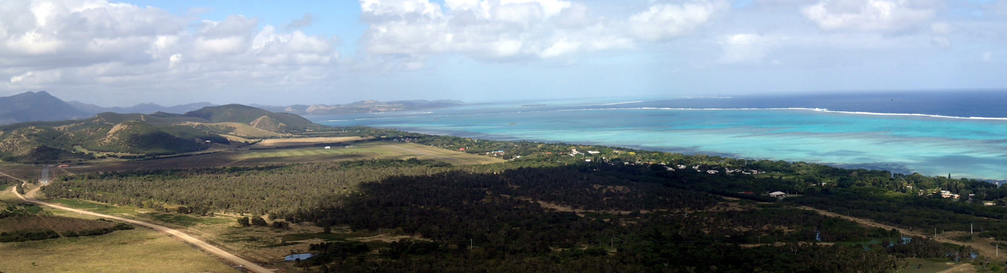 Le 11 août, après un petit-déjeuné face au lagon, on part visiter les environs. On commence par une randonnées d'1h30 sur le sentier des 3 baies qui nous permet de fouler le sable de la baie des tortues et de la baie des amoureux tout en admirant la pointe de la baie de la roche percée et le bonhomme (un monticule rocheux, seul vestige d'une arche tombée il y a quelques années). On parcourt ensuite la foret de Cycas, une plante préhistorique proche de la fougère. On se restaure sur l'aire de pic-nic près de la rivière avant de retourner du coté de Poé, Bien décidés à monter sur un point de vue afin de mieux admirer le lagon. Sur les indications de l'office du tourisme, on part garer la voiture au pied de la colline Oua Koué pour un tour d'1h30 avec une vue imprenable sur la cote. On est heureux d'admirer ce panorama. On file ensuite se baigner, l'eau est un peu fraîche mais on se relaxe tout de même après une bonne journée de marche.