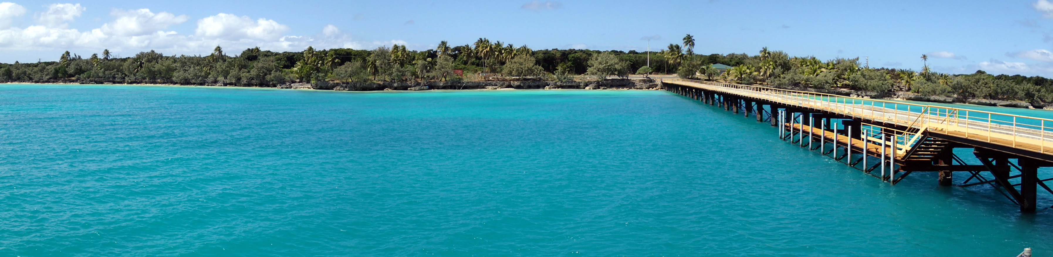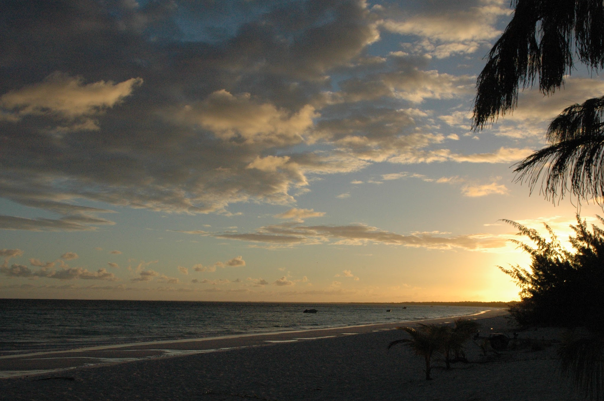 La couleur de l'eau est si transparente qu'on voit les bancs de poissons s'y déplacer depuis la plage. Nous partons ensuite nous balader à une heure et demi de marche, au pont de Mouli. Le site est superbe, le pont permet une vue imprenable des falaises de l'est de l'île et sur l'immense lagon à l'ouest. Du haut du pont on peut voir défiler de gros poissons et de belles tortues qui viennent montrer leur tête à la surface. C'est vraiment chouette mais des nuages arrivent, on décide de rentrer par la plage, on reviendra... c'est certain. On arrive au camping au couché du soleil, on se pose sur la plage pour admirer le spectacle.