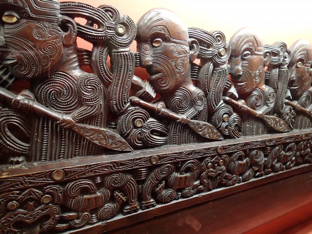 Notre guide d'origine Maori nous commente ensuite le village reconstitué de Pikirangi et la maison commune richement ornée de sculptures. Il nous fait partager un peu sa culture Maori ce qui est très intéressant. On part ensuite découvrir 2 Kiwis, oiseaux très difficile d'observer à l'état naturel car rares et nocturnes. On se balade ensuite dans le reste du parc, entre sources d'eaux chaudes et mares de boue. On fini par l'école de sculpture que compte le parc et qui leur permet de conserver ce savoir faire. On y trouve également une école de tissage que nous n'avons pas visité mais les œuvres se retrouvent sur les murs de la maison commune.