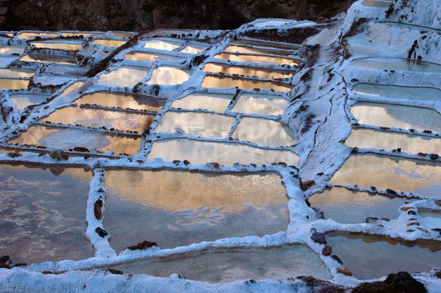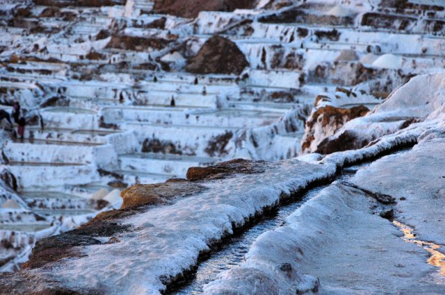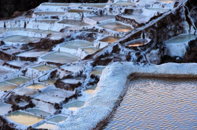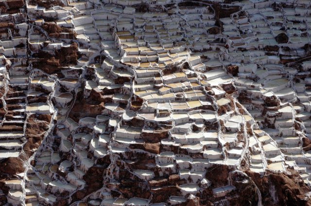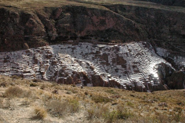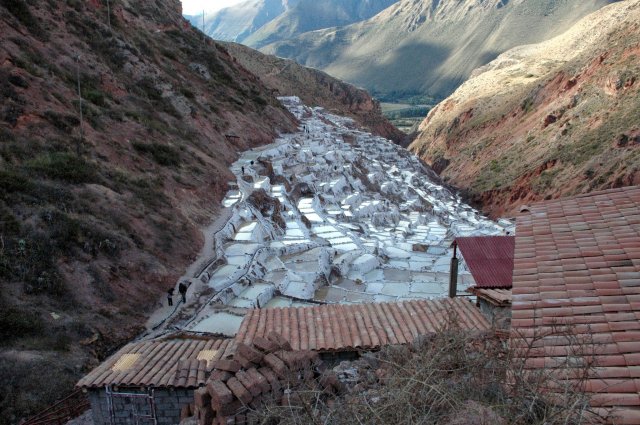 On part ensuite pour le second site, non moins intéressant car il s'agit des Salines de Maras. A cet endroit coule une source d'eau chaude chargée en sel que les Incas ont détournés vers des terrasses pour y récolter le sel. C'est un spectacle grandiose de 5740 petits bassins blancs accrochés à la montagne où y travaillent les habitants du village de Maras. La palette de couleur est aussi ici impressionnante et ravie nos yeux. Nous finissons la journée par un arrêt au point de vue dominant la ville.
