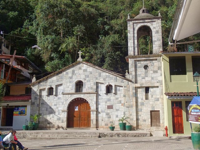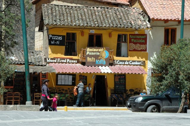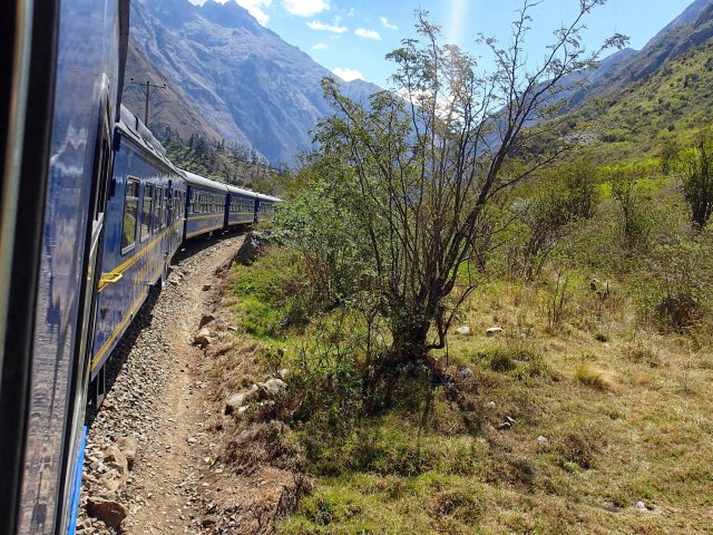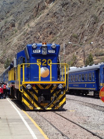 Le train part à 13h pour 2h d'un trajet assez grandiose. On passe d'une vallée large avec des champs de cultures à une gorge très étroite dominée par des falaises. La ville d'Aguas Calientes est coincée au carrefour de 2 gorges. Cette ville toute en hauteur est tournée vers le tourisme. Il faut prendre un peu de recul pour voir la prouesse qu'ont réalisé ces gens de construire tout cela dans un petit endroit entouré de falaises et accessible qu'en train.