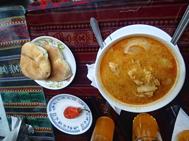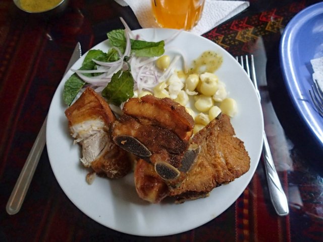 De retour dans la ville on flâné dans les jolies ruelles de cette superbe ville jusqu'à ce qu'on découvre une petite cantine locale où nous dégustons de plats du coin : du chicharon, composé de maïs grillé, patate et porc et un adobo, une sorte de goulash de viande de porc un peu épicé, delicieux. Pour information, la plupart de nos autres repas sont aussi locaux mais pas très variés, en générale une soupe de légume et de riz puis un peu de salade verte, du riz, des pommes de terre et une viande. Ce repas très complet nous coûte souvent 3€, avec aussi une boisson qui ressemble à de la tisane (à l'anis, à la pomme, à l'orange...).