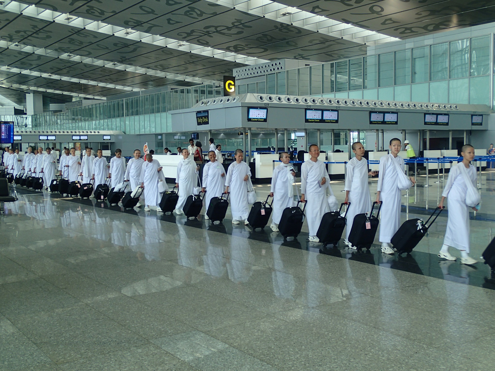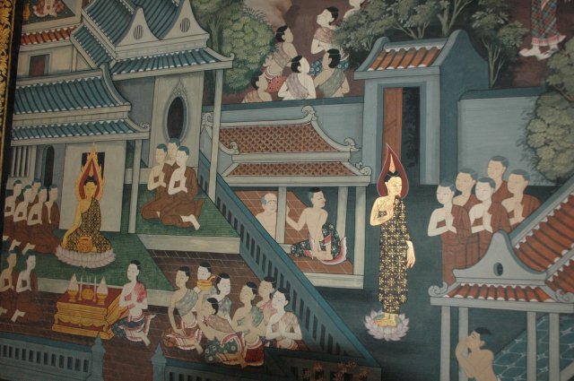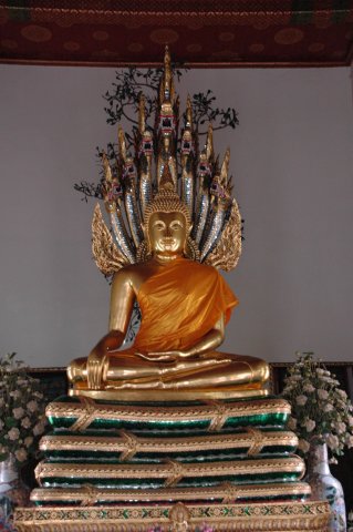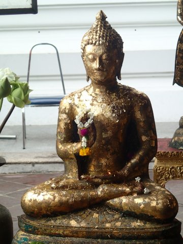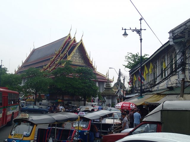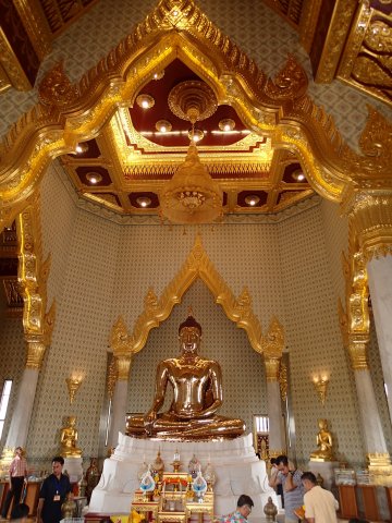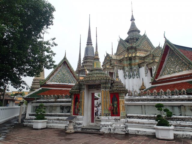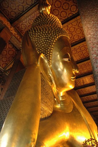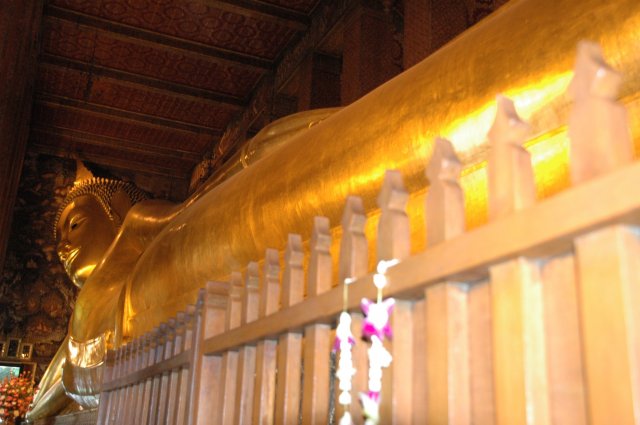 Le Bouddha géant allongé sur son lit de mort attendant le Parinirvāṇa, terme sanskrit signifiant "nirvana" dans le plus grand et le plus ancien temple bouddhiste de Bangkok. Il mesure 45m de long et 15 de haut, ses pieds sont incrustés de nacre représentant les 108 états de Bouddha. Ce lieu est charmant et plein de vie, mais on doit partir il nous reste le grand palais à visiter.