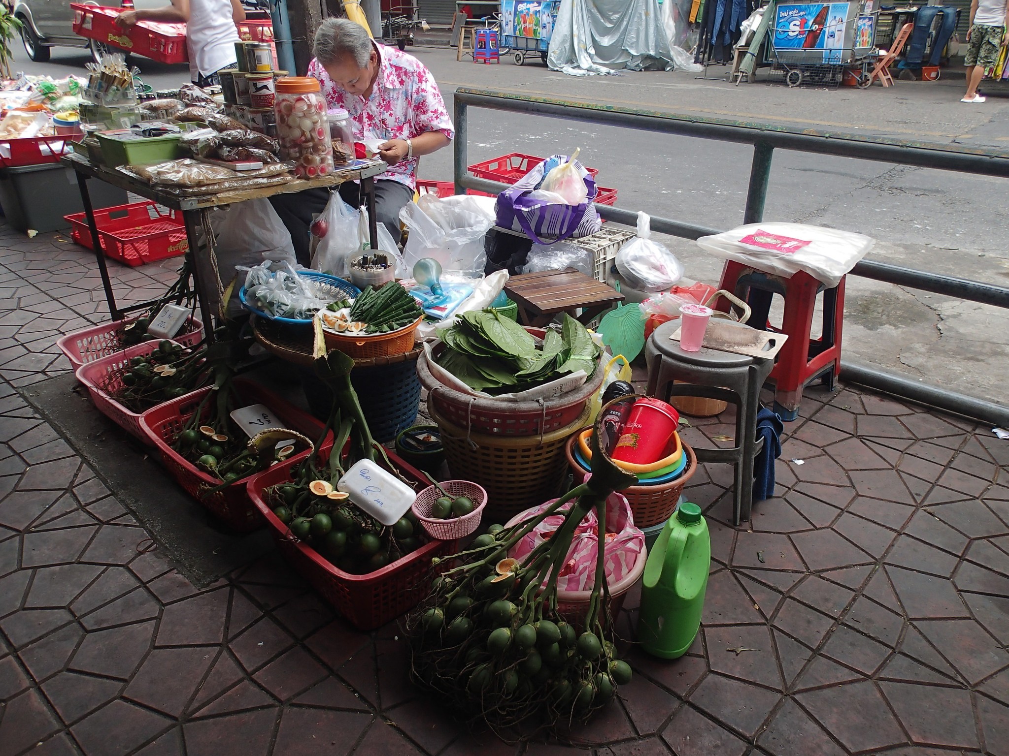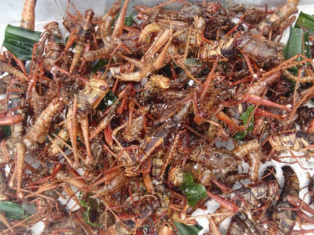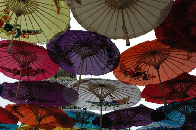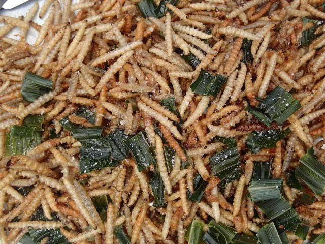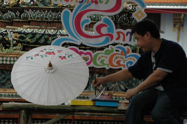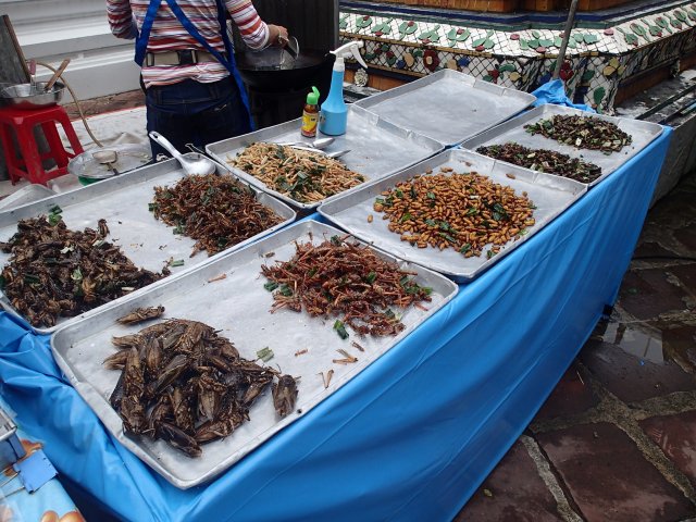 Sur le chemin pour nous rendre au Wat Pho, nous parcourons quelques rues commerçantes. En tout cas il y a de l’animation dans ce Wat ! Pleins de marchands (souvenir, nourriture locale dont des insectes), des démonstrations de peinture sur ombrelle, des moines baptisant les locaux, des croyants achetant des feuilles d’or pour décorer les statues de Bouddha.
