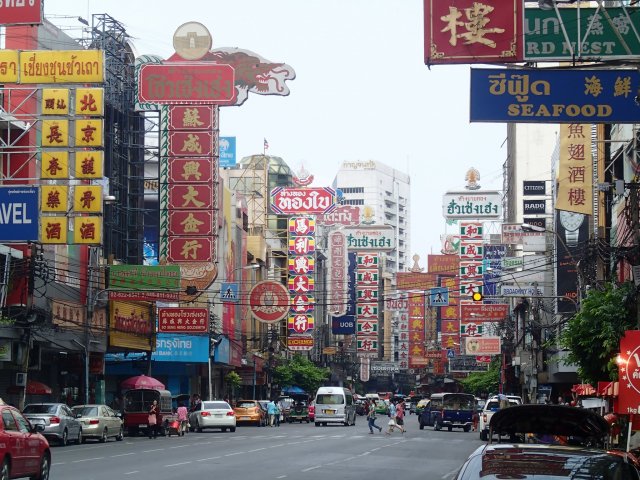 Le 14, nous partons tôt le matin pour échapper aux gouttes des pistolets et visiter tranquillement Chinatown. Bon c’est vrai c’est dimanche et beaucoup de magasins sont fermé, mais c’est sympa quand même. Le quartier est bien différent du reste de la ville, et possède aussi de belles Wat. Bangkok est une grande ville (7762 km2) et aucune carte de la ville n’est correcte. On a donc un peu de mal à se repérer et même les locaux ne savent pas trop nous indiquer ou nous sommes sur la carte… alors on rentrera en taxi !